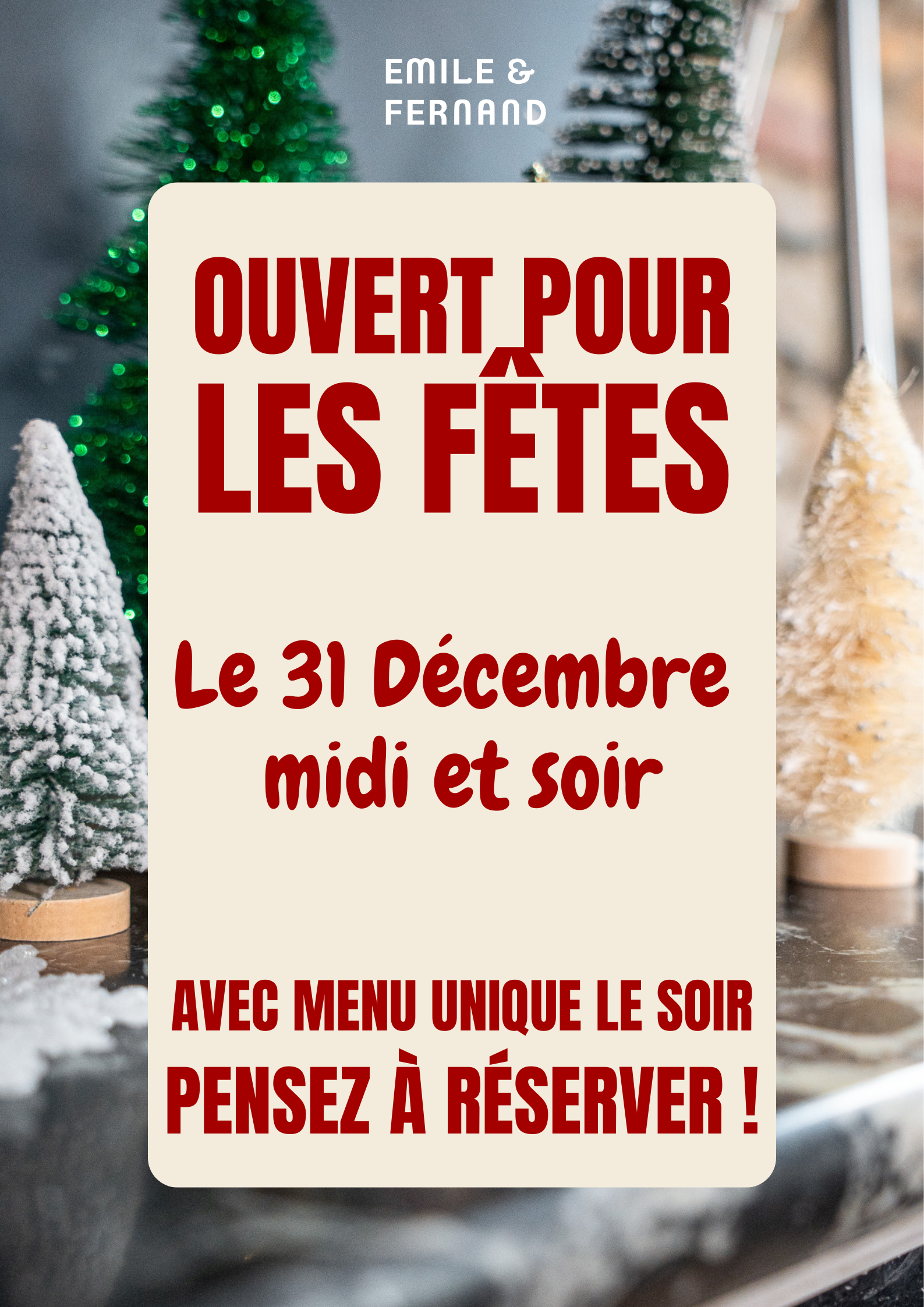 Pour célébrer le passage en 2026, nous vous accueillerons le midi et le soir le 31 décembre, afin de savourer ensemble les tout derniers instants de 2025.